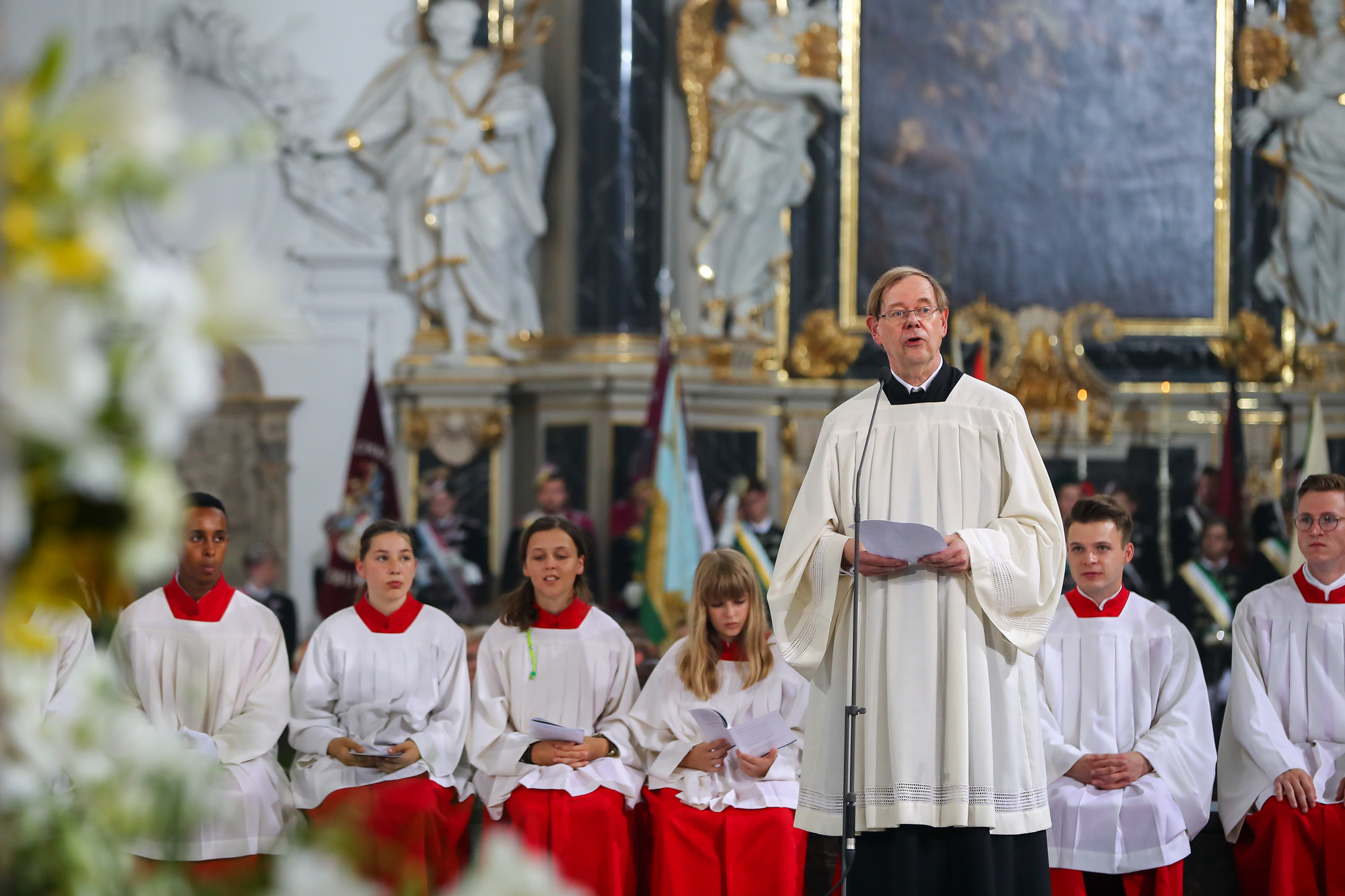 Für den Diözesanrat der Katholiken, das höchste Laiengremium im Bistum, wiederholte Vorsitzender Karl-Peter Büttner das bei der Ernennung gegebene Versprechen der engagierten Unterstützung. „Nicht Strukturdiskussionen dürfen alles überlagern, sondern wir müssen unser Tun als geistlichen Prozess begreifen, der zum Ziel hat, die menschenfreundliche Botschaft des Evangeliums im eigenen Leben und auch für die Mitmenschen in unserer Umgebung und Zeit neu zum Strahlen zu bringen.“ Papst Franziskus habe betont, das gute Funktionieren der Räte sei für die Kirche entscheidend, erklärte Büttner. „Da wir als Getaufte und Gefirmte durch Christus selbst zur Teilnahme an der Heilssendung berufen sind, brauchen wir nicht in Allem auf amtliche Beauftragungen zu warten, sondern sollen uns mit Freude und Elan, selbstbewusst und doch bescheiden einmischen, mitreden und mittun, wenn es um den Kern der Botschaft Jesu geht.“ Gemeinsam mit dem Bischof wollten die Laien im Bistum Würzburg der Botschaft des Evangeliums auch in der säkularen Welt Gehör verschaffen, damit Freude und Hoffnung, Trauer und Angst der Menschen nicht aus den Augen gerieten. Dem neuen Bischof wünschte er viel Freude bei und mit den Franken, damit er gegenüber Gästen in Zukunft wie Kilian nach der ältesten Überlieferung über das Würzburger Land sagen könne: „Seht, Brüder, wie schön ist das Land und wie angenehm die Menschen!“