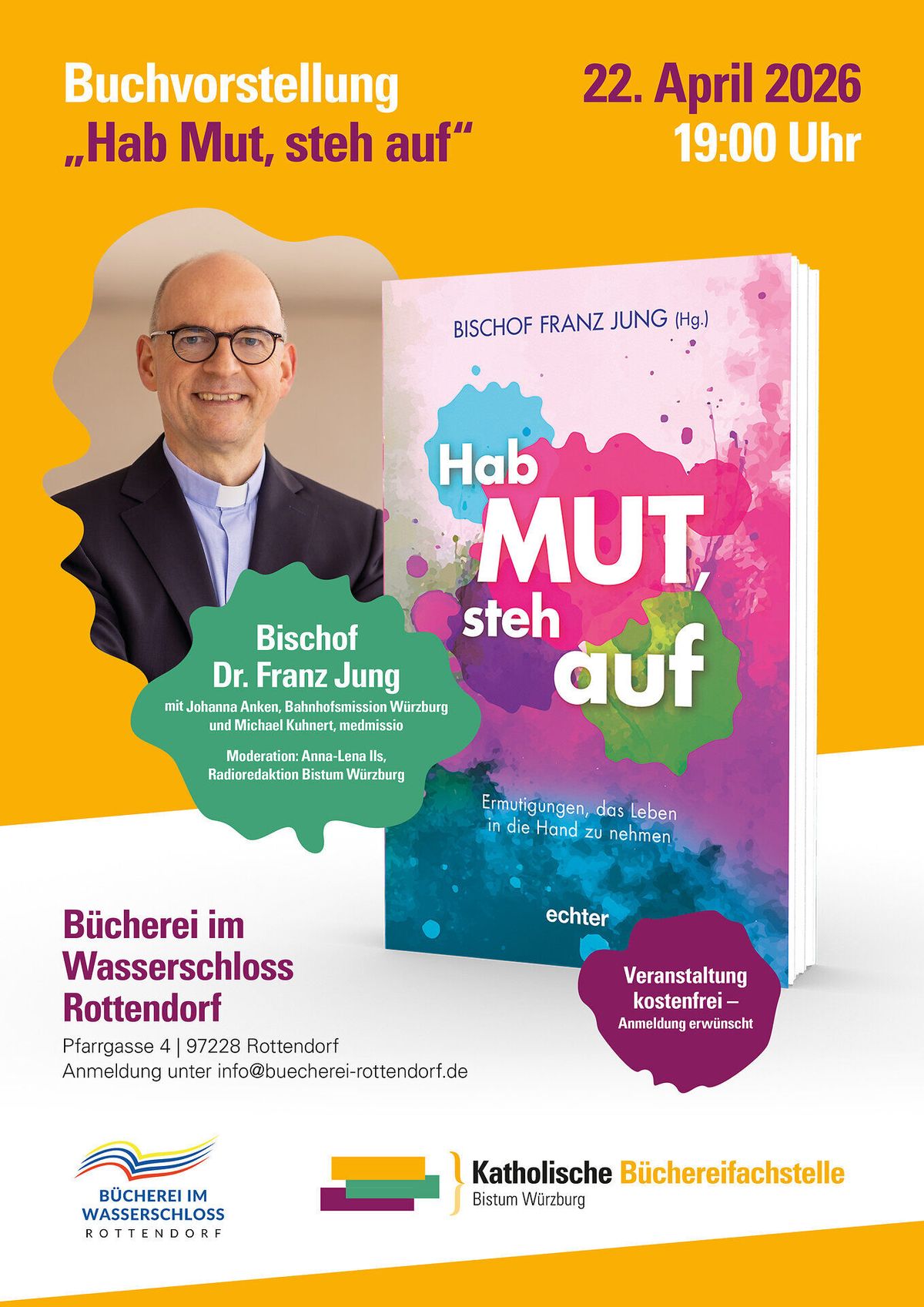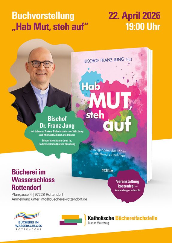 Bischof Dr. Franz Jung, der Herausgeber, spricht gemeinsam mit Johanna Anken von der Bahnhofsmission und Michael Kuhnert von Medmissio über Entstehung und Anliegen des Buches. Zudem lesen sie ausgewählte Passagen. Die Moderation übernimmt Anna-Lena Ils von der Hörfunkredaktion des Bistums Würzburg. Das Buch versammelt Stimmen aus Kirche, Gesellschaft, Sozialarbeit, Wissenschaft, Kunst und weltkirchlichem Engagement. Es zeigt, wie Menschen Krisen bewältigen, Wendepunkte meistern und trotz Widerständen neu aufstehen. Die Beiträge greifen das Leitwort des Katholikentags 2026 in Würzburg auf und weiten es bewusst über das Ereignis hinaus. Die 20 Autorinnen und Autoren erzählen über ihre ganz persönlichen Erfahrungen von Mut: in der Caritas, im Ordensleben, in der Bahnhofsmission, in der Frauen- und Jugendpastoral, in der Queer-Seelsorge, in der internationalen medizinischen Hilfe, in der Wallfahrt und in der Theologie. Diese Vielfalt macht das Buch zu einem einzigartigen Stimmenpanorama aus gelebtem Glauben, gesellschaftlicher Verantwortung und persönlicher Stärke. Der Eintritt ist frei. Eine Anmeldung wird erbeten per E-Mail an info@buecherei-rottendorf.de oder telefonisch unter 09302/9892872 während der Öffnungszeiten.
