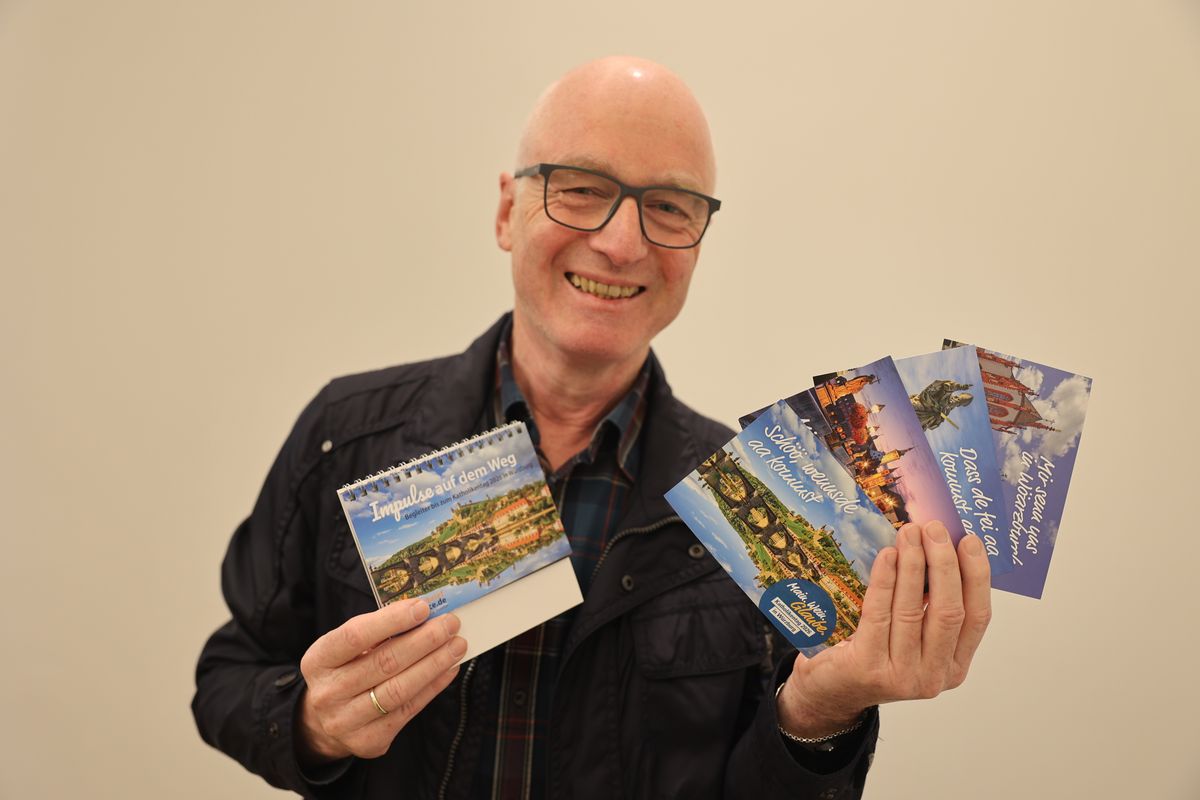 Als Give-aways für besondere Gäste hat das Team um Liebler kleine Bocksbeutel im Gepäck. Darüber hinaus gibt es am Stand vier verschiedene Postkarten mit Motiven der Stadt Würzburg und Einladung im Dialekt zum Katholikentag 2026 sowie Informationen wie beispielsweise Stadtpläne von Würzburg, um Interessierten bereits Material an die Hand geben zu können. Für die Kinder gibt es Bastelbögen des Würzburger Doms.