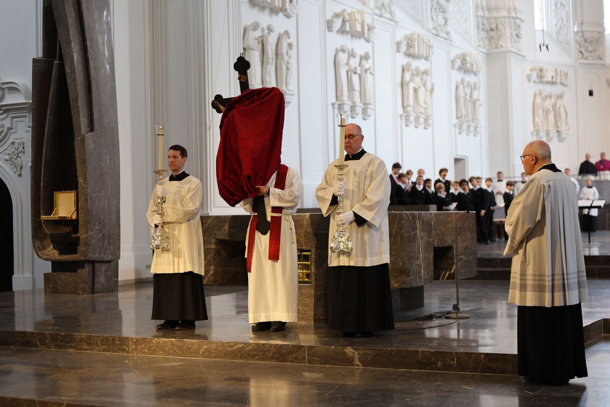 Bei den sogenannten Großen Fürbitten des Karfreitags beteten die Gläubigen für die Kirche, den Papst, alle Stände der Kirche, die Taufbewerber, die Einheit der Christen, die Juden, für alle Menschen, die nicht an Christus glauben, für alle Menschen, die nicht an Gott glauben, für die Regierenden und für alle notleidenden Menschen. Bei der Kreuzverehrung wurde das Kreuz enthüllt, den Gläubigen gezeigt und in stillem Gebet verehrt. Die Würzburger Domsingknaben unter der Leitung von Domkantor Julian Beutmiller sangen die „Johannespassion“ von Alois Maria Müller, „Vexilla regiss“ von Anton Bruckner, „Eli, Eli!“ von Georgius Bardos, „Popule meus“ von Tomás Luis de Victoria und „O crux ave“ von Rihards Dubra.